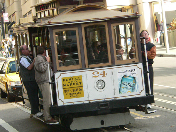 Once we arrived in The City, the plan was to take the cable car from the Powell street end of the line and ride it to the Cable Car Museum, which also happens to be the “barn” where they park the cable cars overnight, but when we arrived at the “turnaround” (they literally turn the cable cars around on giant turntables) the line was out of control. It would have taken hours to get on a cable car, so we started walking toward the museum, toward a very steep hill, while I tried to think of an alternative method of travel. I saw one of the cable car operators sitting on a cable car waiting his turn to go down the way and pick up passengers, so I stopped and asked him, “Short of taking a cable car, what’s the best way to get to the Cable Car Museum?”