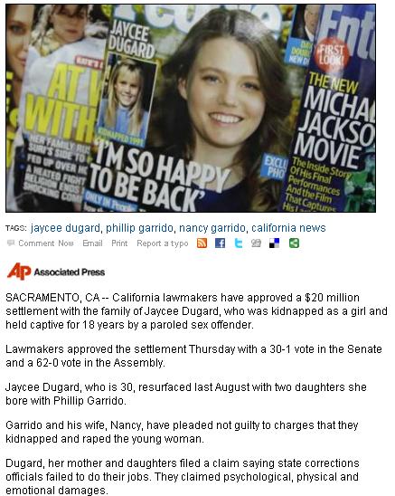 And let us not forget where all this money the government doesn’t have comes from, shall we? IT COMES FROM ME!!! And all the people like me who are working hard just trying to scrape by on the meager salaries we earn. And now some Yahoos in Sacramento thinks it’s justifiable to give $20 million of my hard-earned money to the family of this girl, just because she was abducted by a crazy, sexual predator? The family somehow see’s this as justice? Give me a break!!!