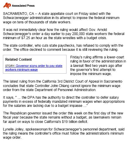 Now, I can understand the thinking behind lowering employees salaries, temporarily, in the midst of a budgetary crisis.  I know it would suck, a lot, to be one of those 200,000 workers whose salary was suddenly and without warning cut by more than 75%, but I can understand the reasoning behind it.  But get this, Governor Schwarzenegger isn’t just cutting people’s salaries to minimum wage; oh no, he’s cutting it to the Federal Minimum Wage.  The Federal Minimum Wage is $7.25 an hour.  In California, the state minimum wage is $8.00 an hour and there are many counties with a cost of living differential where the minimum wage is even higher.